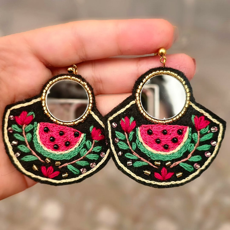گوشواره ای از مجموعه شب یلدا با طراحی خاص و دستدوزی که جزئیات آن از عشق و صبر ساخته شده است.